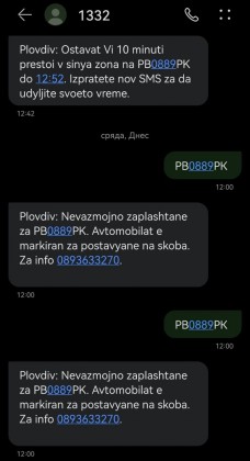 Накратко – в 12.00 ч. паркирахме в северната част на бул.“Марица“ и веднага след излизането си от автомобила жена ми потърси в чантата телефона си и изпрати СМС на номер 1332.